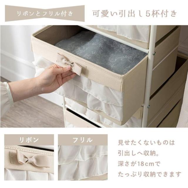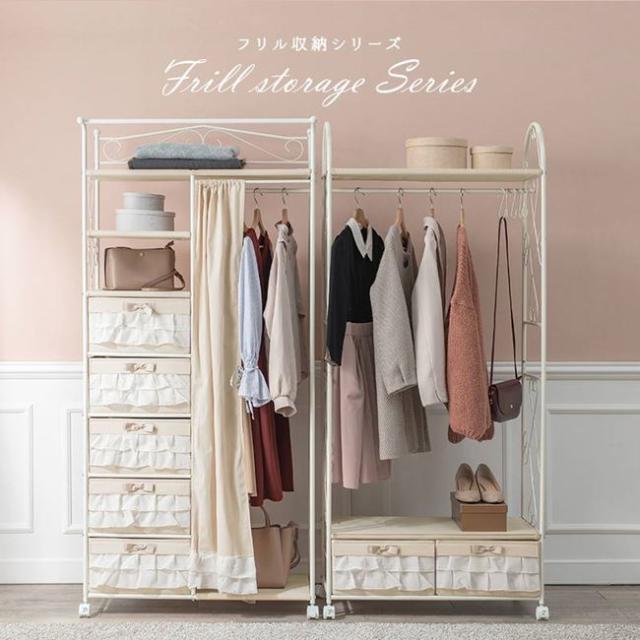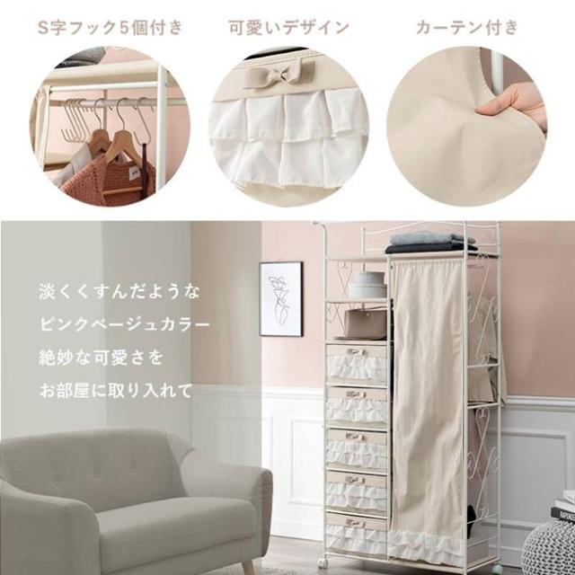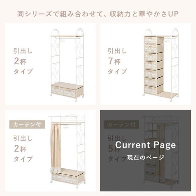 ハンガーラック おしゃれ フリルチェスト付き 80×172cm 引き出し5段 カーテン付き キャスター付き