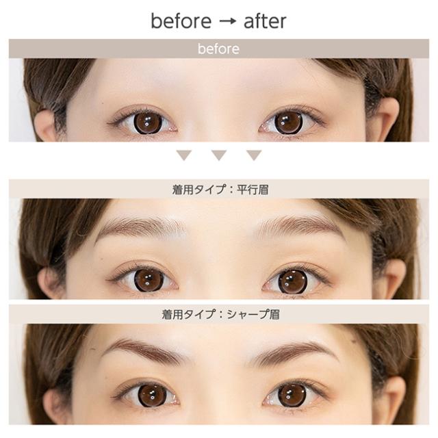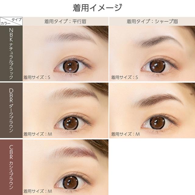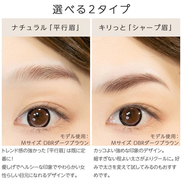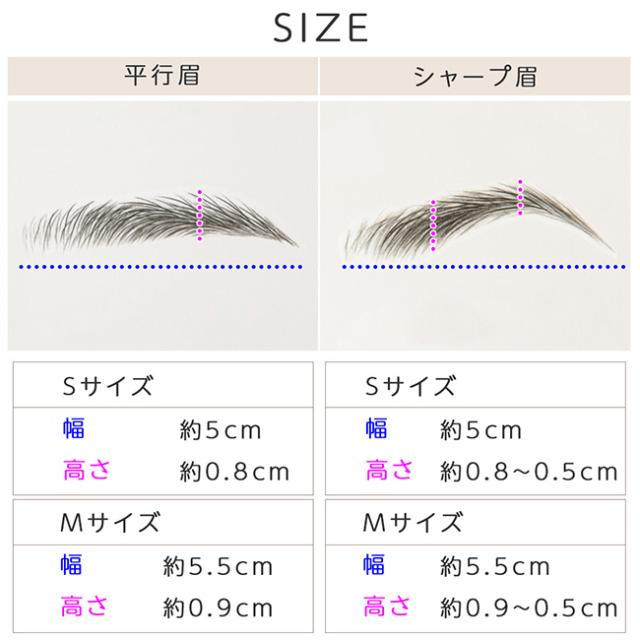 | サイズ | [ナチュラル平行眉] Sサイズ 幅:約5cm 高さ:約0.8cm Mサイズ 幅:約5.5cm 高さ:約0.9cm [キリっとシャープ眉] Sサイズ 幅:約5cm 高さ:約0.8cm〜0.5cm Mサイズ 幅:約5.5cm 高さ:約0.9cm〜0.5cm |