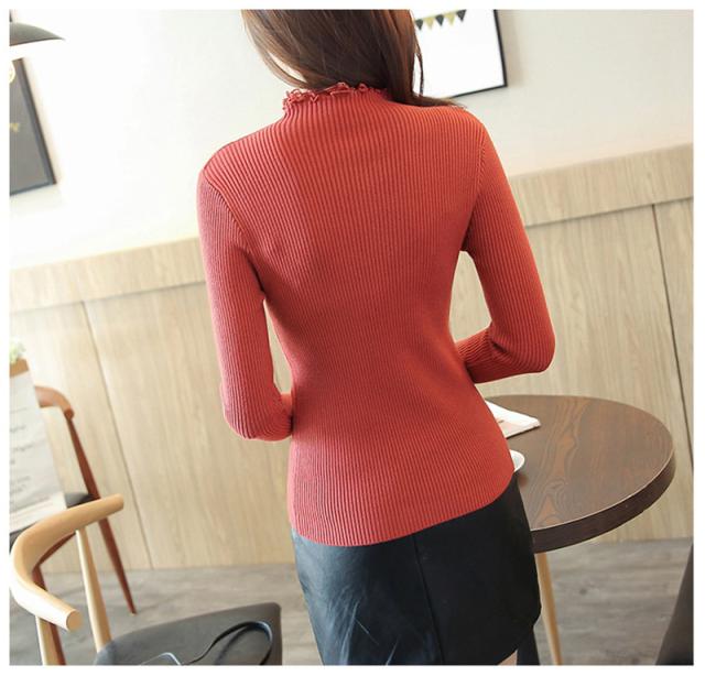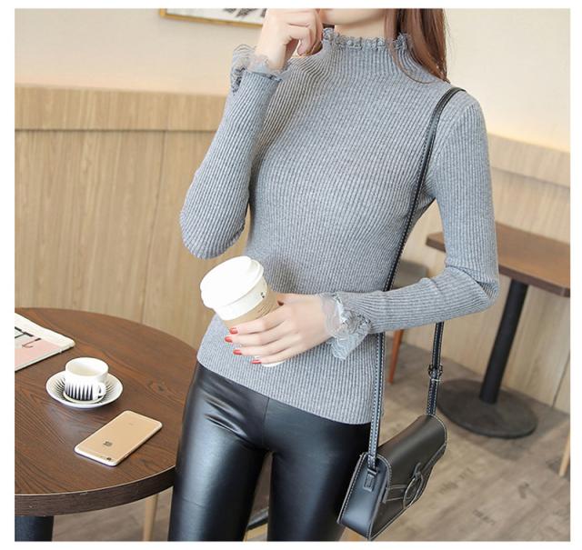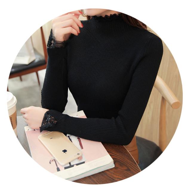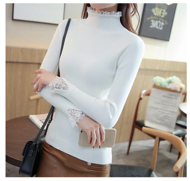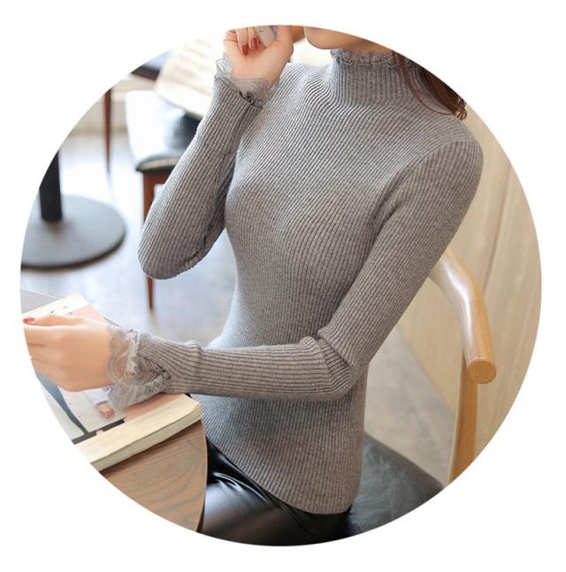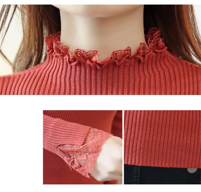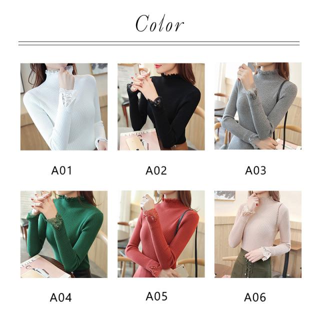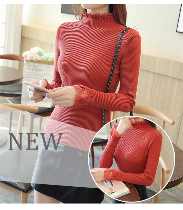 ニットセーター 秋冬 レディース リブニット トップス ハイネック レースフリル襟 長袖 ニットソー スリムフィット ニットウェア