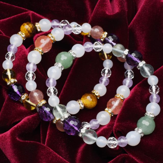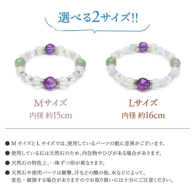 | 材質(±0.5mm) | 1-A 癒やし 128面カット 合成アメジスト:10mm 128面カット グリーンアベンチュリン:10mm グリーンフローライト:8mm ホワイトカルセドニー:8mm ラベンダーアメジスト:6mm ホワイトカルセドニー:6mm(Lサイズのみ) 64面カット 水晶:6mm 銀ロンデル:4・6mm 1-B 恋愛 128面カット 合成アメジスト:10mm 128面カット チェリークォーツ:10mm ストロベリークォーツ(レッドアベンチュリン):8mm ホワイトカルセドニー:8mm ラベンダーアメジスト:6mm ホワイトカルセドニー:6mm(Lサイズのみ) 64面カット 水晶:6mm 金ロンデル:4・6mm 1-C 金運 128面カット 合成アメジスト:10mm 128面カット イエロータイガーアイ:10mm 合成シトリン:8mm ホワイトカルセドニー:8mm ラベンダーアメジスト:6mm ホワイトカルセドニー:6mm(Lサイズのみ) 64面カット 水晶:6mm 金ロンデル:4・6mm |