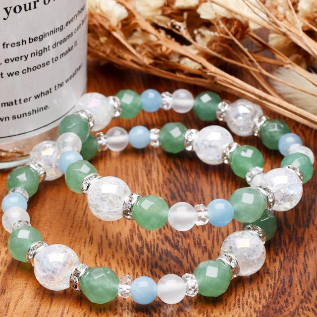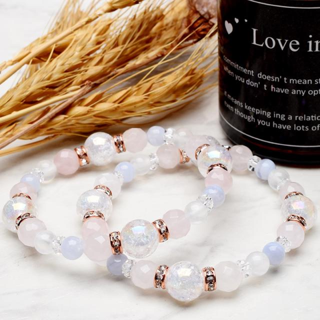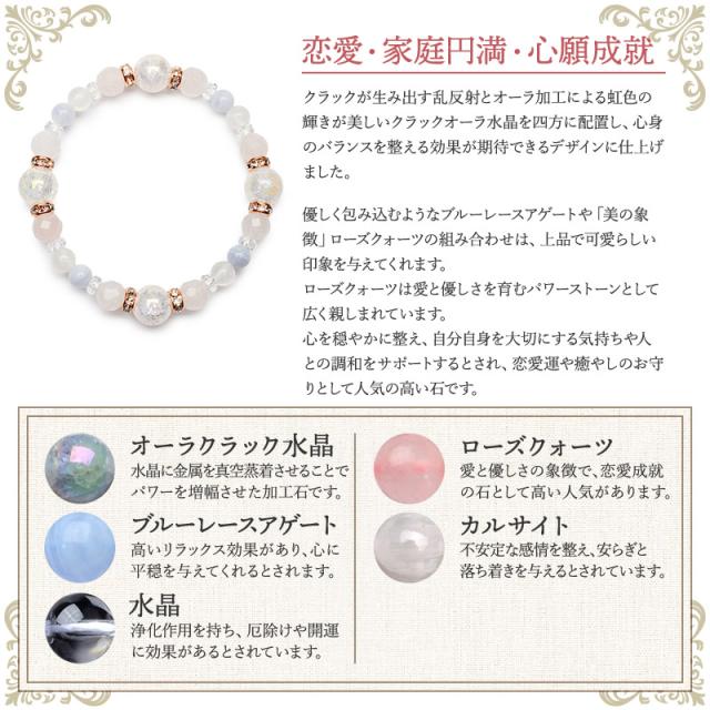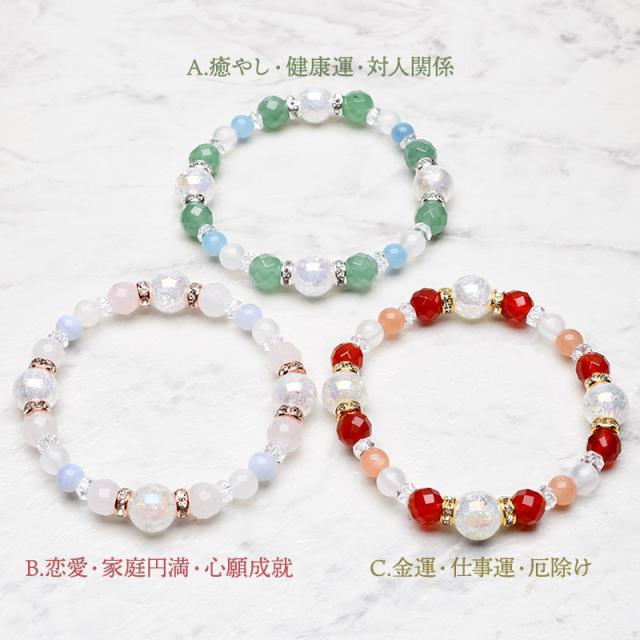 | 材質(±0.5mm) | 1-A 癒やし クラックオーラ水晶:10mm グリーンアベンチュリン:8mm アクアマリン:6mm ホワイトカルサイト:6mm 水晶:2×5mm 銀ロンデル:6mm 1-B 恋愛 クラックオーラ水晶:10mm ローズクォーツ:8mm ブルーレースアゲート:6mm ホワイトカルサイト:6mm 水晶:2×5mm ピンクゴールドロンデル:6mm 1-C 金運 クラックオーラ水晶:10mm 64面カット カーネリアン:8mm オレンジサンムーンストーン:6mm ホワイトカルサイト:6mm 水晶:2×5mm 金ロンデル:6mm |