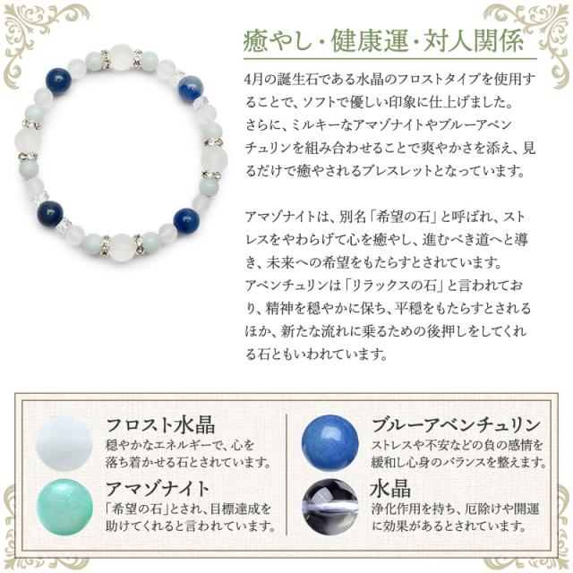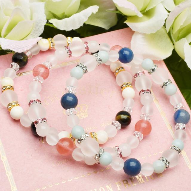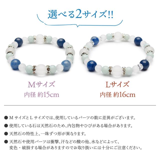 | 材質(±0.5mm) | 1-A 癒やし フロスト 水晶:6・8mm ブルーアベンチュリン:8mm アマゾナイト:6mm ボタンカット 水晶(Lサイズのみ):2.5x5.5mm 銀ロンデル(クリアー):6mm 1-B 恋愛 フロスト 水晶:6・8mm チェリークォーツ:8mm ローズクォーツ:6mm ボタンカット 水晶(Lサイズのみ):2.5x5.5mm 銀ロンデル(ピンク):6mm 1-C 金運 フロスト 水晶:6・8mm イエローブルータイガーアイ:8mm ゴールデンシャコガイ:6mm ボタンカット 水晶(Lサイズのみ):2.5x5.5mm ロンデル(クリアー):6mm |