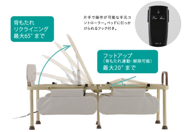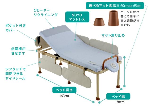 小さなサイズに使いやすい工夫を盛り込みました ベッド長さ169cmのコンパクトな電動リクライニングベッドにSOYO内蔵マットレスをセットしました