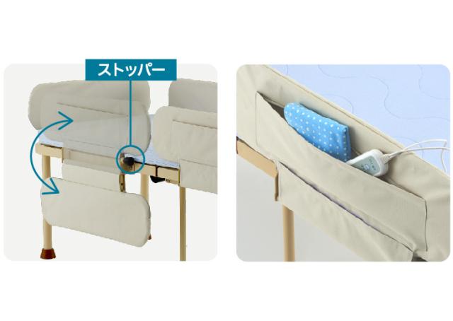 その他にもワンタッチで開閉できるサイドレールなど、お子様のケアに使いやすい仕様です。省スペースなので、みんなが集まるリビングにも置きやすく「もっと子どものそばにいたい」という家族の気持ちを叶えます。