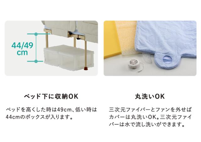 ・ベッド下に収納OK・・・ベッドを高くした時は49cm、低い時は44cmのボックスが入ります。・丸洗いOK・・・三次元ファイバーとファンを外せばカバーは丸洗いOK。三次元ファイバーは水で流し洗いができます。