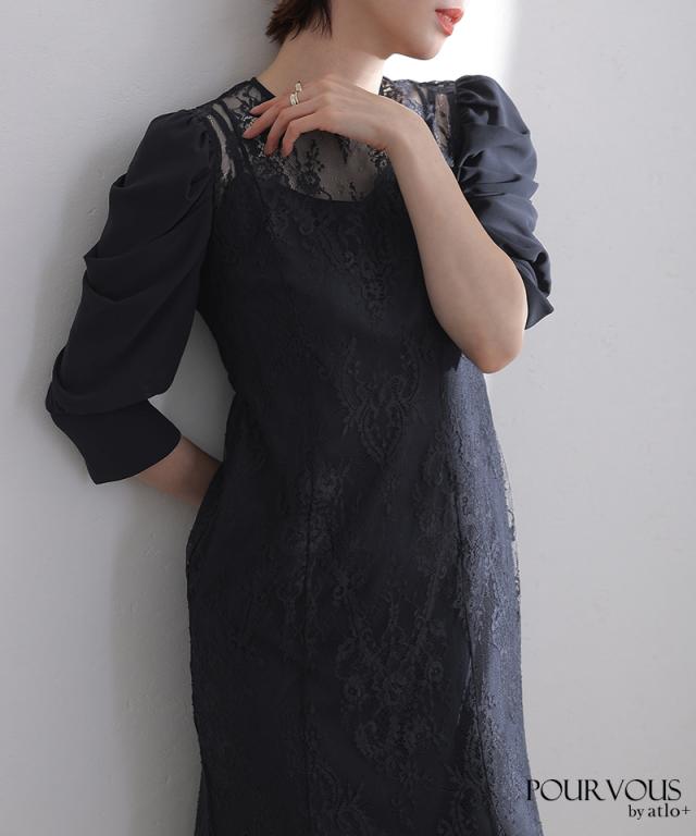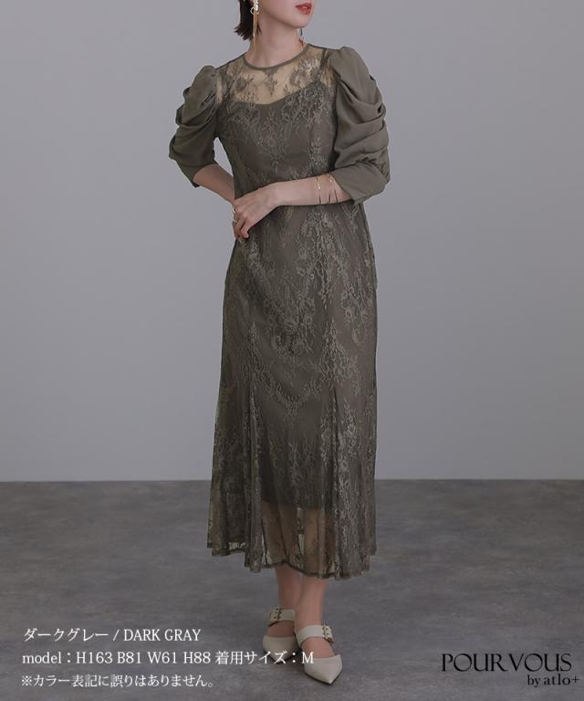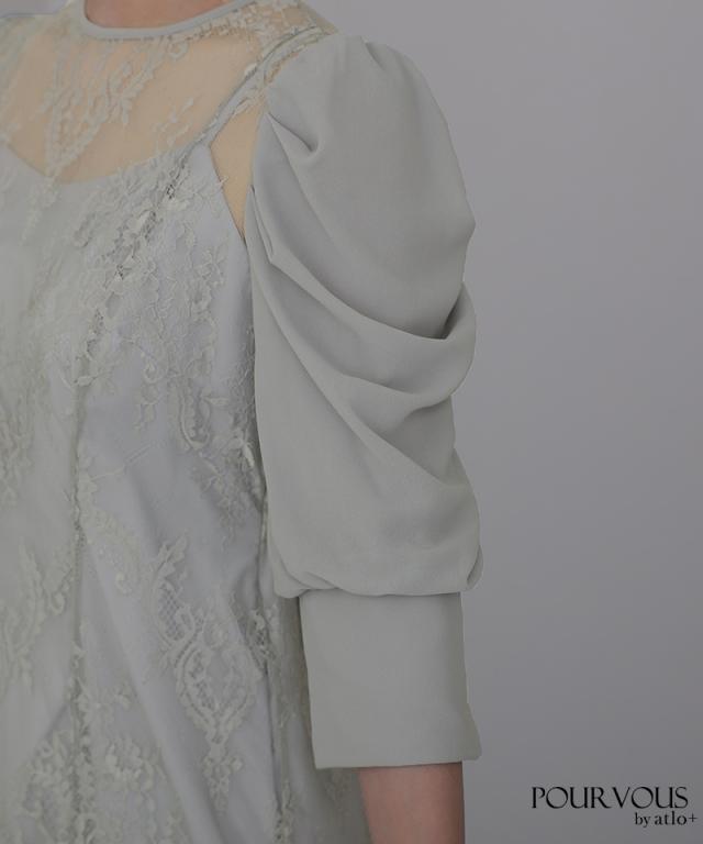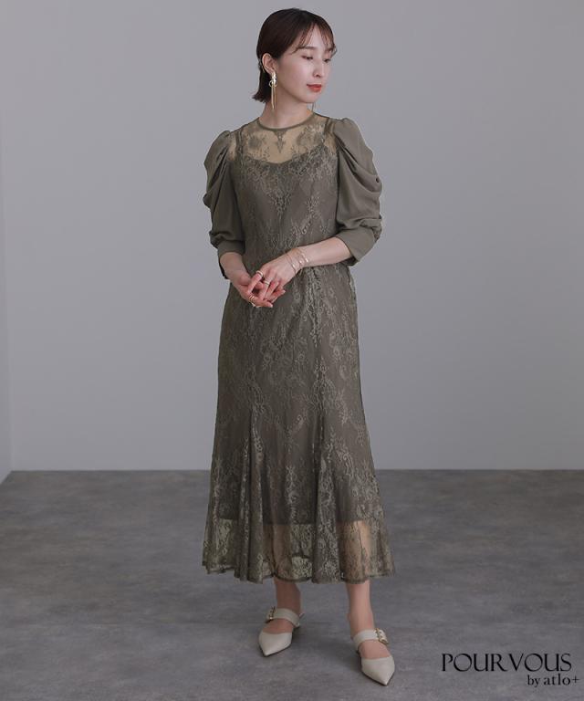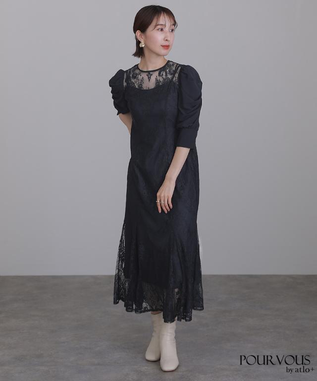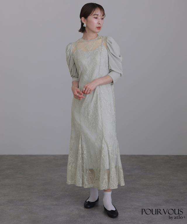 ボリューム袖とレースの切り替えがかわいらしいワンピース。