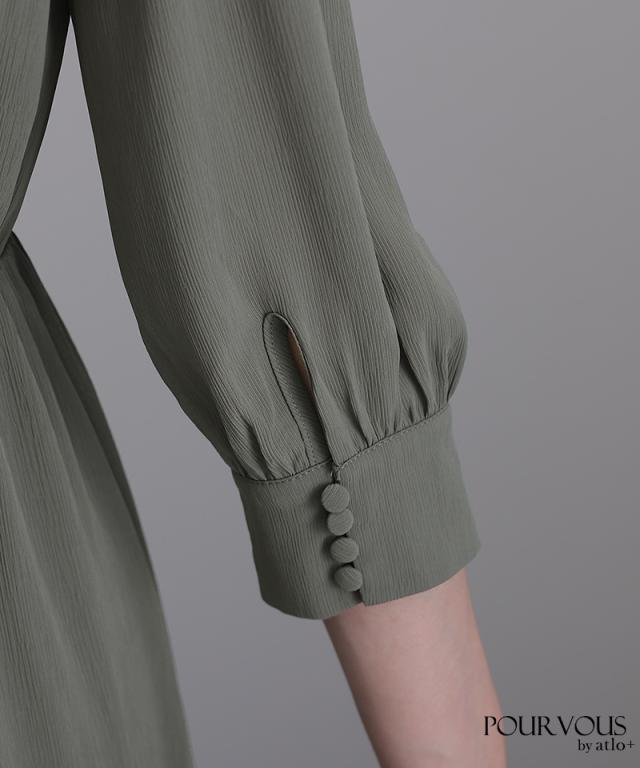 胸元のリボンとさりげないボタンがアクセントのお洒落なデザイン。