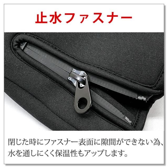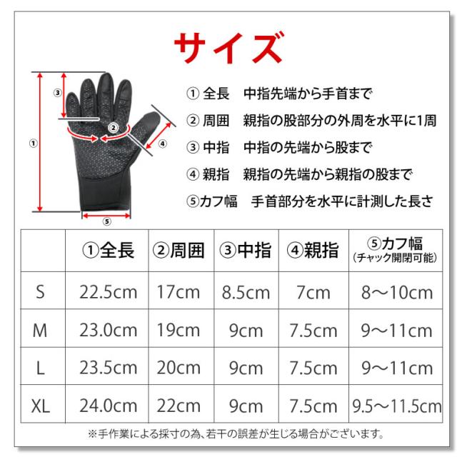 サイズ | 【サイズ 全長 周囲 中指 親指 カフ幅(チャック開閉可能)】 Sサイズ 22.5cm 17cm 8.5cm 7cm 8から10cm Mサイズ 23.0cm 19cm 9cm 7.5cm 9から11cm Lサイズ 23.5cm 20cm 9cm 7.5cm 9から11cm XLサイズ 24.0cm 22cm 9cm 7.5cm 9.5から11.5cm |
