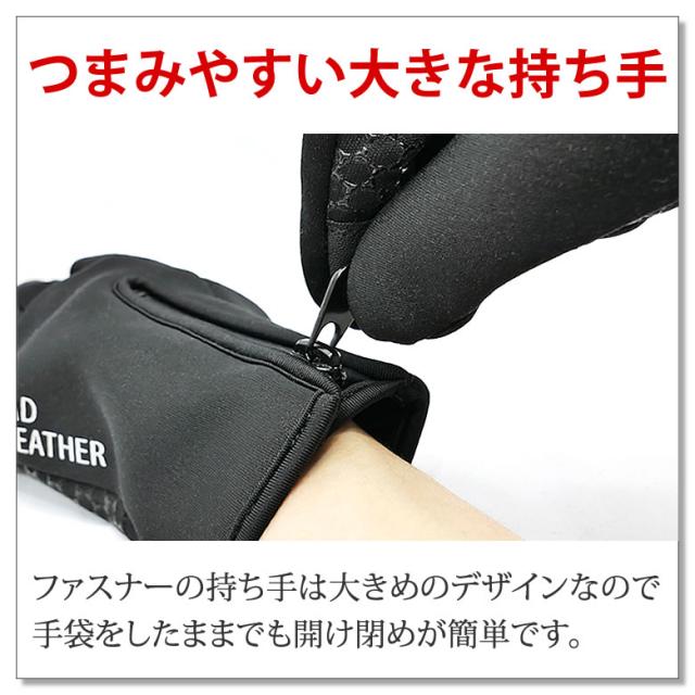 | アウトドアブランドのラドウェザー から、寒い時期の普段使いにオススメな防寒グローブが誕生。 生地にこだわり、内側と外側の両方から保温性を高める素材を使用しています。 内側は指先まで暖かさを保つことのできる保温性の高いフリース素材。 外側はウェットスーツにも使われている生地で、冬の冷たい風を通しにくい素材になっています。 さらに手の甲部分の表面にはTPUフィルムという防水素材に、撥水加工も施されているため突然の雨でも安心です。 保温性だけでなく、普段使いや通勤通学での使用を想定した使いやすさも抜群! 左右の人差し指、中指、親指はタッチパネル対応。 グローブを付けたままでもスマートフォンやスマートウォッチの操作が可能なので、 指先が冷える冬でもいちいちグローブを外す必要がありません。 手のひらには網目状に滑り止め加工がされており、 網目状にすることで、高い滑り止め効果と手の動きを妨げない柔軟性を両立。 自転車のハンドルを握ったり、野外での軽作業時にしっかりグリップできます。 手の甲側にある止水ファスナーにも注目。 チャックを開け閉めすることで、スムーズな着脱を実現し、 閉じた時には隙間ができないため、水を通しにくく保温性もアップします。 持ち手は、手袋をしたままでも持ちやすい大きなデザインになっています。 冬の寒さも、このグローブを日常生活に取り入れれば指先まで暖かく、快適に乗り越えることができます! ■保温性抜群のフリース素材 内側は保温性が高く肌触りが柔らかいフリース素材で、指先まで暖かさを保ちます。 ■冷たい風を通しにくい 外側はウェットスーツにも使用される保温性の高い素材で、冬の冷たい風を防ぎます。 ■雨にも安心のはっ水 生地には撥水加工をしているため、水がかかっても粒状になって転がり落ちます。 ■水が浸みこまない 手のひらの表面は水を通しにくいTPUフィルムをサンドした3層構造で、水の侵入を防ぎます。 ■使いやすさも抜群 暖かいだけではなく、日常生活で使いやすい便利な機能が充実。 ■タッチパネル対応 人差し指、中指、親指は手袋を付けたままでもスマホの操作が可能なタッチパネル対応。 ■すべり止め付き 手のひら全体に滑り止めつきでしっかりグリップ。自転車や野外での軽作業にもおすすめです。 ■スムーズな着脱が可能 急いで取り外したい時にも、寒くてすぐに着けたい時にも便利なファスナー付きです。 ■止水ファスナー 閉じた時にファスナー表面に隙間ができない為、水を通しにくく保温性もアップします。 ■つまみやすい大きな持ち手 ファスナーの持ち手は大きめのデザインなので手袋をしたままでも開け閉めが簡単です。 | |