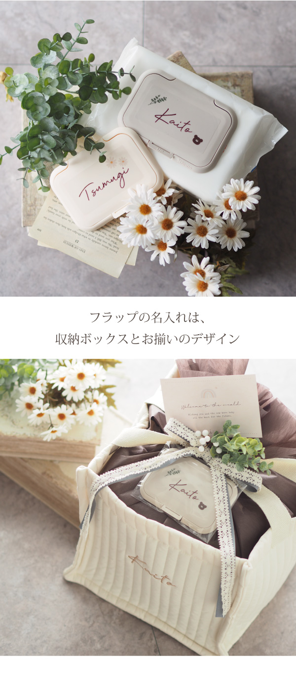 ボックスとウェットティッシュのフタにはお揃いの名入れができます。トレンドなおしゃれな字体にもこだわりました。