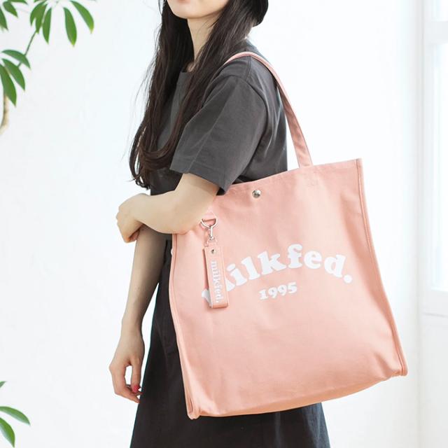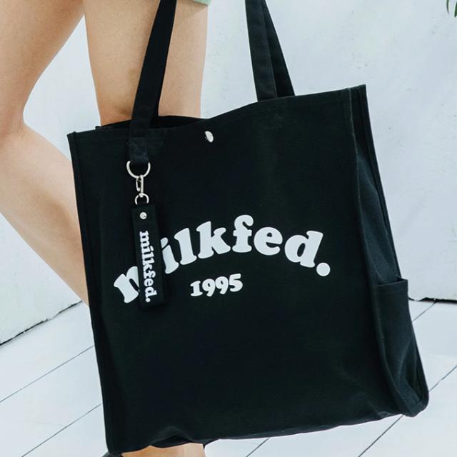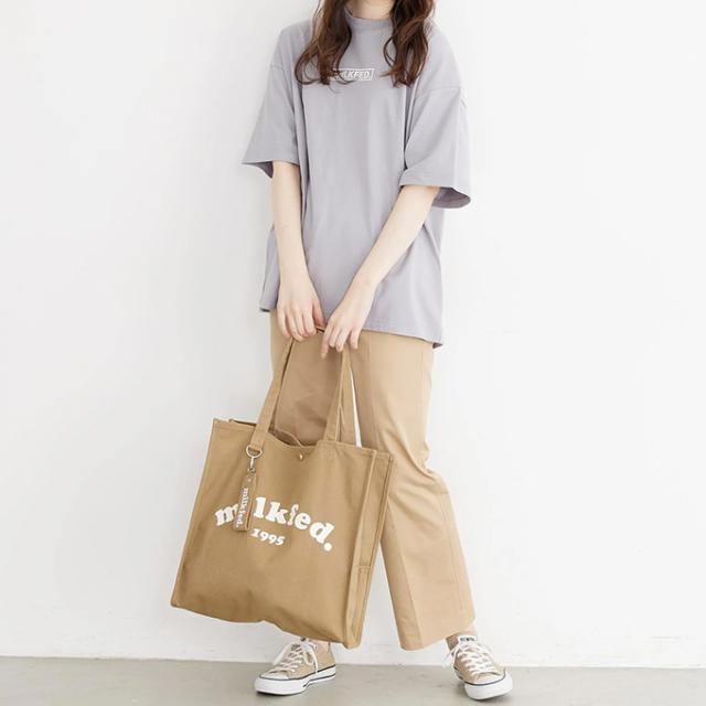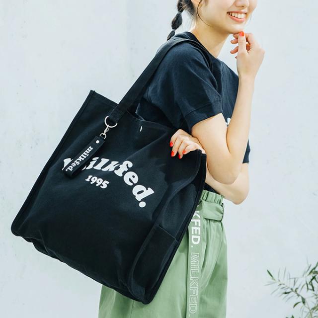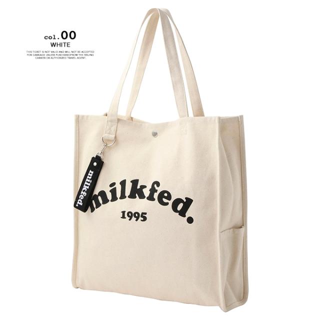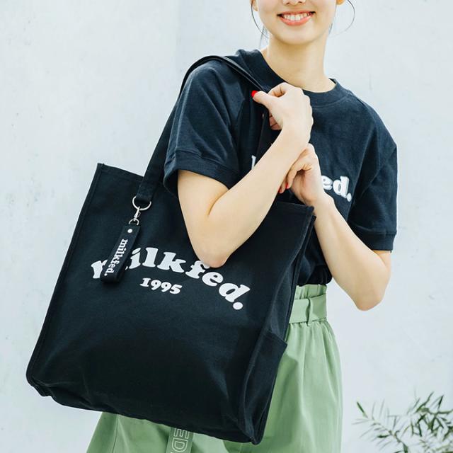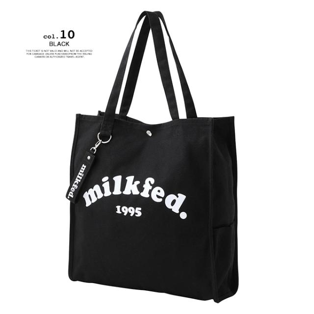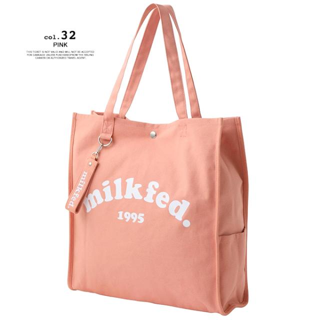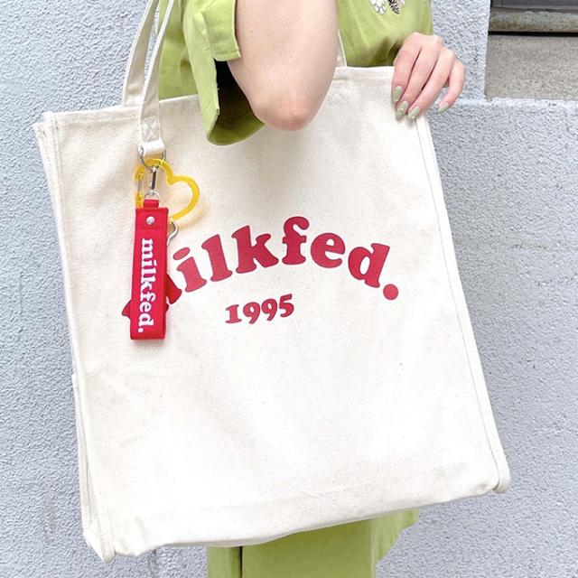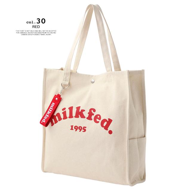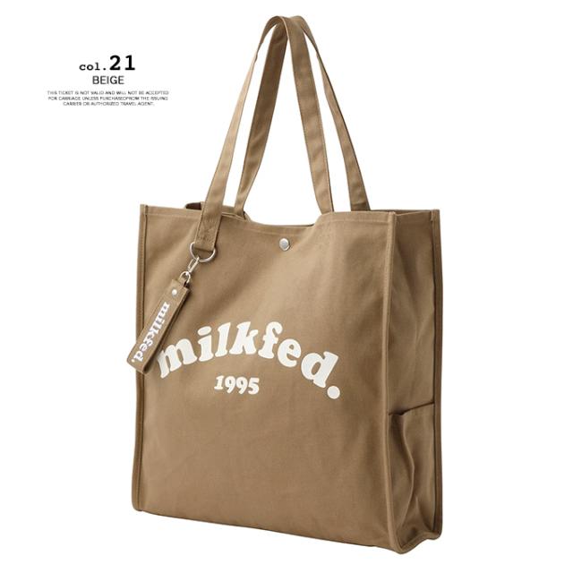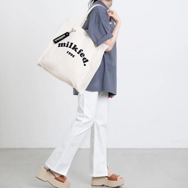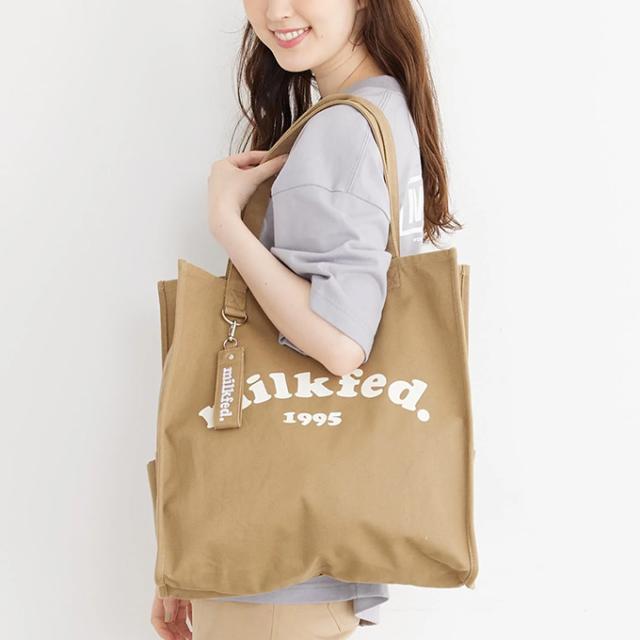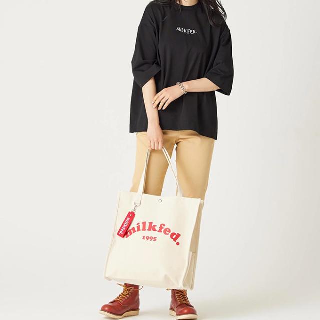 A4サイズがすっぽりと入る、スクエアシルエットのトートバック♪ 大きく入ったMILKFED.のブランドロゴが目を引くデザイン! |