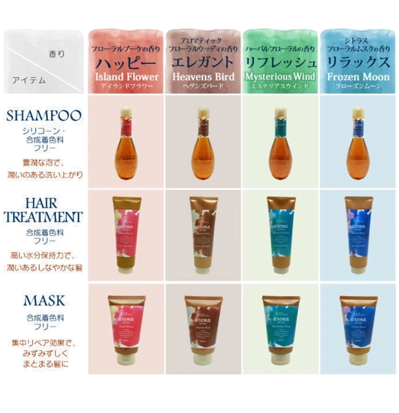 【ヘアシーズンズ アロマシロップスとは…】高い保湿力を持ち、たっぷりのミネラルを含んだテオシロップを全アイテムに配合したヘアケアシリーズ。 テオシロップは、メキシコを中心とした乾燥地域で育つ「竜舌蘭(リュウゼツラン)」から採れる成分で、髪や頭皮をうるおいのある状態に導き、美しいツヤを表現します。 また、シャンプー、トリートメント、マスクに世界の国々をイメージした4つの香りが展開されています。 好きな香りをお選びいただくことで、まるで世界中を旅しているようなバスタイムを愉しむことができます。