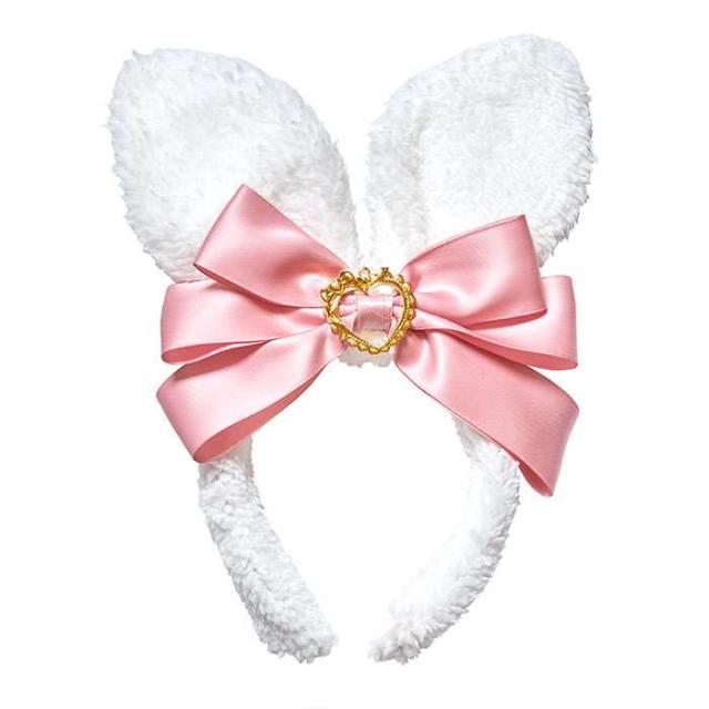 丸みを帯びた可愛らしいフォルムのうさ耳と大き目のリボンが可愛いカチューシャです。うさ耳はふわふわで手触りバツグン。リボンにはハートのパーツが付いていて、より可愛くゴージャスな印象に。うさ耳は針金が入っていて曲げることでたれ耳にすることもできちゃいます!