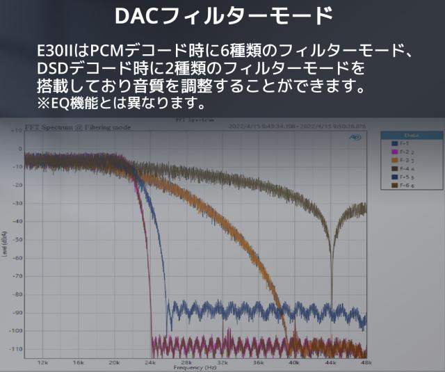 E30IIはPCMデコード時に6種類のフィルターモード、DSDデコード時に2種類のフィルターモードを搭載しており音質を調整することができます。