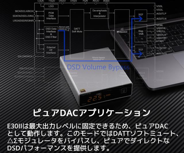 E30IIは最大出力レベルに固定できるため、ピュアDACとして動作します。このモードではDATTソフトミュート、