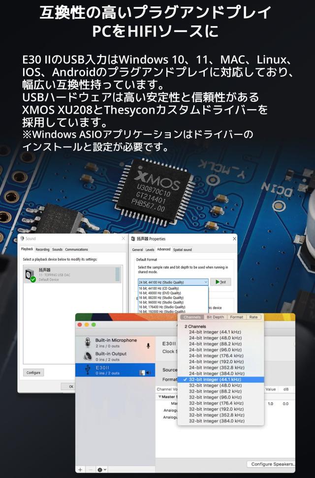 E30IIのUSB入力はWindows(ウインドウズ) 10、11、MAC(マック)、Linux(リナックス)、iPhone(アイフォン)やiPad(アイパッド)などのIOS、Android(アンドロイド)のプラグアンドプレイに対応しており、幅広い互換性持っています。
