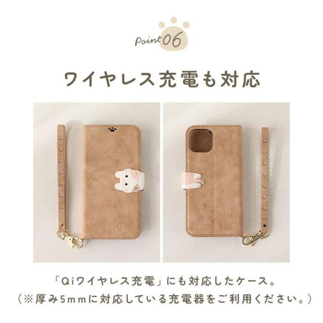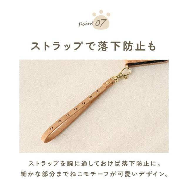 ・フラップ上部にフタを閉じたまま通話ができる、肉球をかたどったスピーカーホール付き。そのほかケースの随所に肉球マークの型押しを施し、細部までこだわったつくりにも要注目。