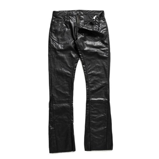 太ももまで細くシェイプし、裾に切り替えのわずかなフレアを加えた「B型フィット」の最新スリムレザーパンツ。