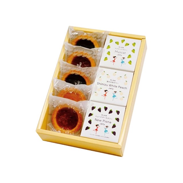 岡山県産果実のなめらかなゼリーと国産果実のコンフィチュールを流し込んだタルトの詰合せ福岡県産あまおう、青森県産りんご、岡山県産いちご、岡山県産ブルーベリー、岡山県産マルベリーのコンフィチュールを流し込んでしっとり焼き上げたタルトと、岡山県産果実(清水白桃、ニューピオーネ、マスカット)の素材本来の味わいや風味を楽しめる彩り鮮やかなゼリーを詰め合わせました。内容:フルーツゼリー90g(清水白桃・ニューピオーネ・シャインマスカット×各1)、タルト(いちご、ブルーベリー、マルベリー、あまおう、りんご×各1)特定原材料等:卵・小麦・乳成分・もも・りんご・大豆箱サイズ:縦25cm×横17cm×高さ5cm賞味期限:製造日より常温90日※賞味期限は原則として製造・加工日を基準に記載いたしております。 到着後の日持ち期限は配送日数などにより異なりますので目安としてご覧ください。※代理購入となります。ご了承ください。※パッケージ内容・お味は告知なく変更となる可能性が御座います。ご了承ください。