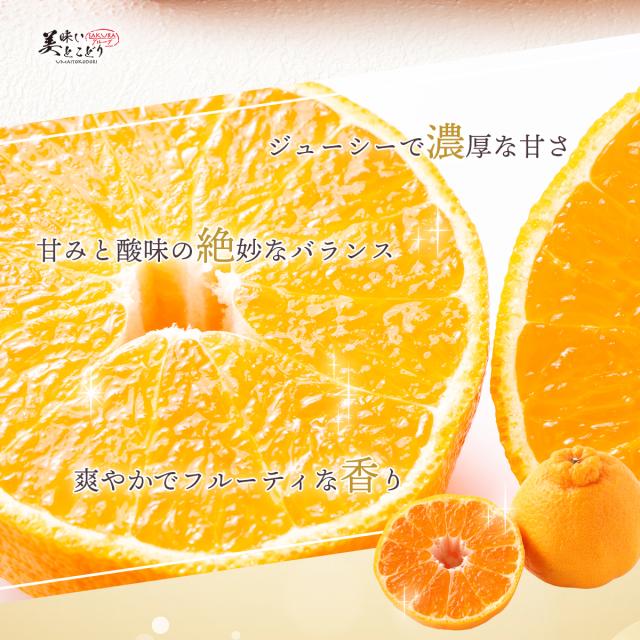 きよみとポンカンの交配種。甘味も酸度も高いバランスの取れた濃い味。 皮はむきやすく、じょうのうは(果実の袋)は薄く柔らかいのでそのまま食べられます。