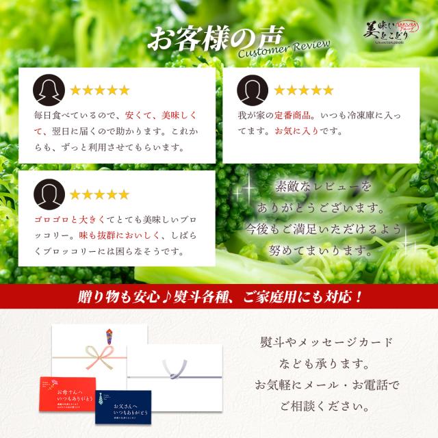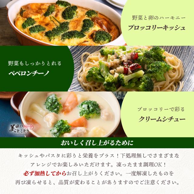 旬の時期に収穫したブロッコリーを新鮮なうちに冷凍。シャキッとした食感と自然な甘みをそのまま閉じ込めています。 加熱するだけで、サラダやスープ、炒め物などにすぐ使えるのが魅力。忙しい毎日に、手軽に野菜をプラスできます。 新鮮なブロッコリー本来の甘みと香りで食感はしっかり、ほくっとした口当たりです。 冷凍庫に常備しておけば、いつでも必要な分だけ使えてムダなし!お弁当にも便利!時短料理の強い味方です。