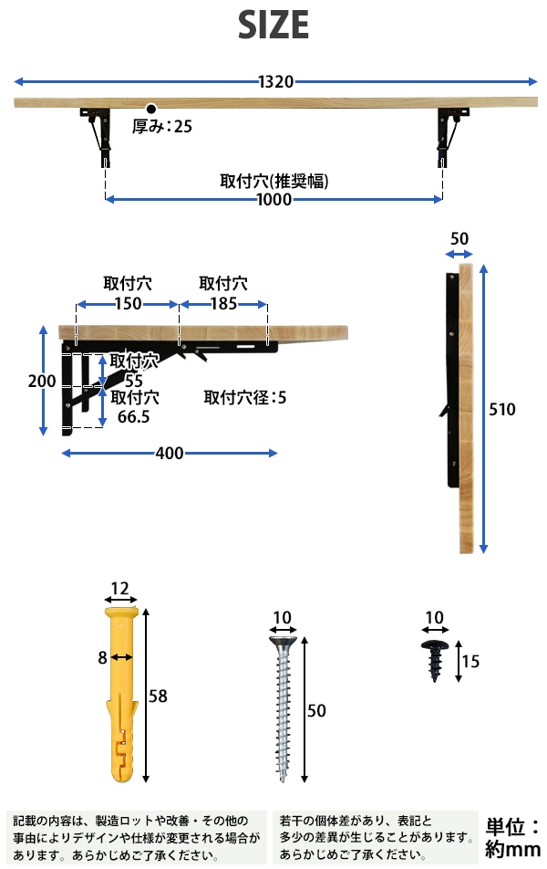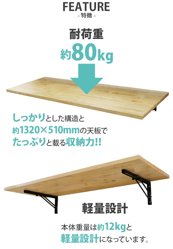 ●勉強机や作業机など様々な場所・用途で活躍できる壁掛け式のテーブルです。 ●重量は約12kgと軽量設計の壁掛けテーブルです。 ●約1320×約510mmの広い作業スペース! ●壁掛け式なので壁面を有効に活用できます。 ●ブラケットはスチール製なので硬く強度があり、耐久性にも優れています。 ●天板にはオーク材を使用し、頑丈で温かみのある作りになっています。 ●ニス塗りの加工が施されているので汚れ強く、耐アルカリ性、耐酸性、耐湿性に優れた天板です。 ※こちらの商品は、組立て式です。 (組み立てにはプラドライバーが必要です。お客様でご用意下さい。) 壁に取り付ける際、ネジの取り付けが硬い場合は、インパクトドライバーをご準備の上ご使用下さい。 ●塗装:ニス(天板)、クロムメッキ塗装(ブラケット) ●重量:約12kg ●均等荷重…約80kg ●材質:オーク材(天板)、スチール(ブラケット) ●付属品:組立説明書、ネジ、ナイロンプラグ ●新品商品ではありますが、輸入商品の為、多少の擦り傷などがある場合がございますので、ご納得の上ご購入下さいませ。 ●ご購入後、お客様ご都合によるご返品、ご返金等は一切お受け致しておりません。 ●本商品を使用した際に発生したトラブル、事故につきまして、当社は一切の責任を負いません。ご使用に関しましては、全て自己責任にてお願い致します。 |