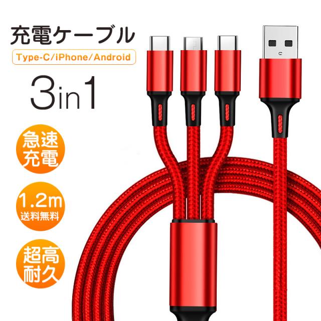 【キーワード】Type-C&Micro USB&iPhone 3in1充電ケーブルケーブル 高耐久ナイロン素材 充電ケーブル