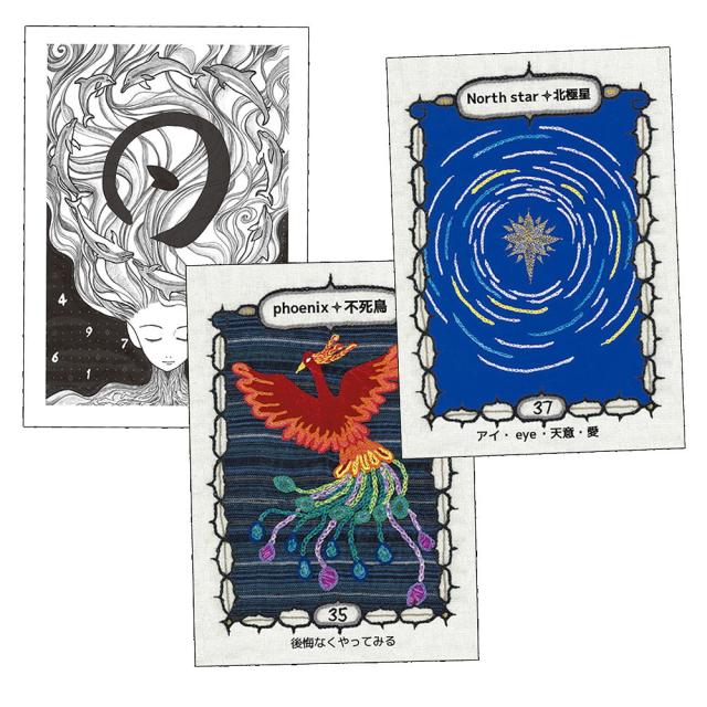 このカードは著者・藍佑佳さんが宇宙の大いなる意図から感じたメッセージを37枚のイメージに、さらに8枚の八卦と+1枚を追加して合計46枚に創作したものです。糸(意図)を使い、刺繍で描いています。