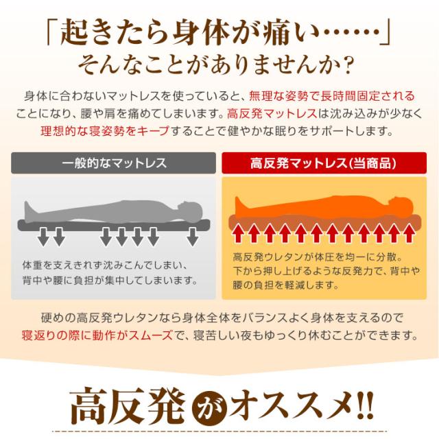 厚みたっぷりの高反発ウレタンが体をしっかり支え、底付き感を軽減。