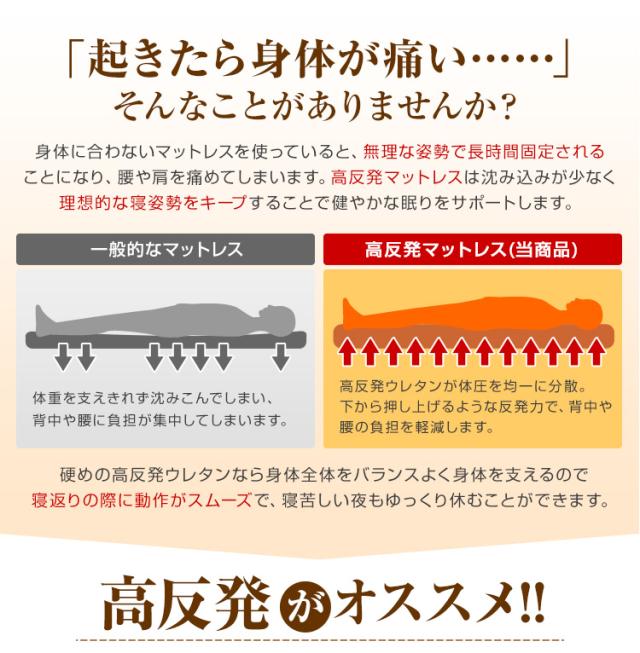 厚みたっぷりの高反発ウレタンが体をしっかり支え、底付き感を軽減。