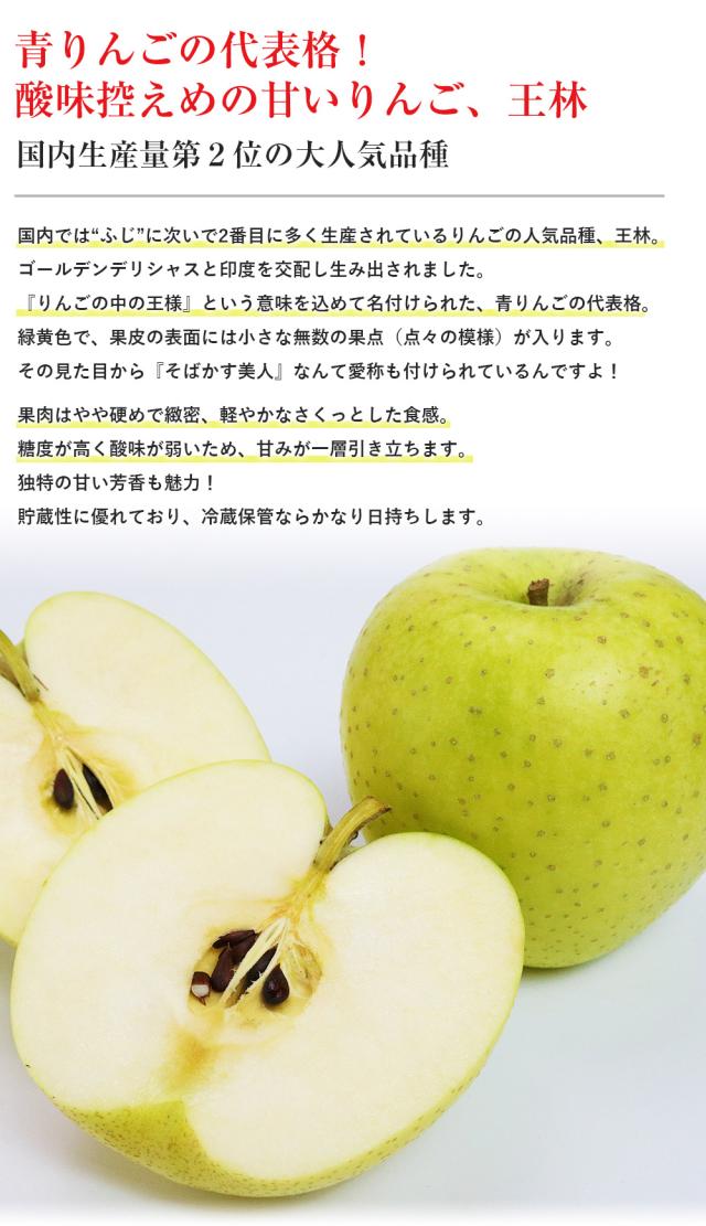 王林…ふじに次いで国内で2番目に多く生産されている、こちらも大人気の品種。