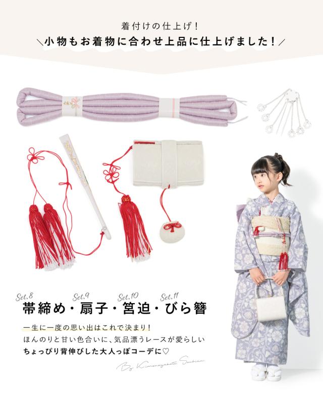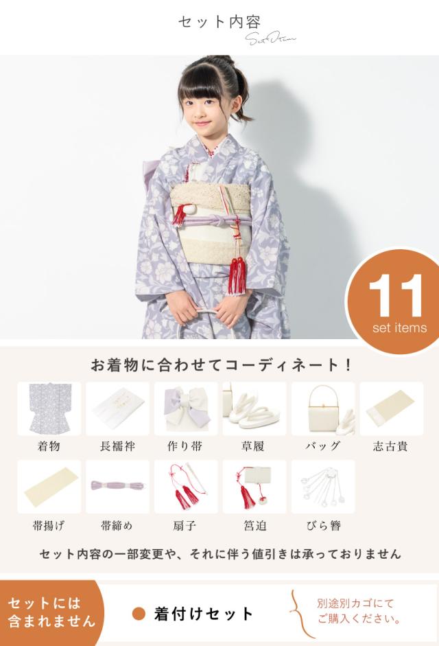 セット内容は【着物・長襦袢・作り帯・草履・バッグ・志古貴・帯揚げ・帯締め・扇子・筥迫・びら簪】の11点です。