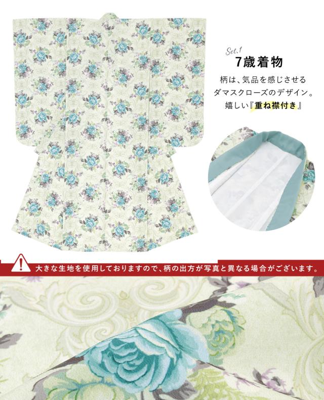 七五三 着物 7歳 販売 七歳 着物セット 女の子 作り帯 筥迫 草履 バッグ 11点セット 緑系 水色 ダマスクローズ 和服 和装 女児 仕立て上がり 送料無料