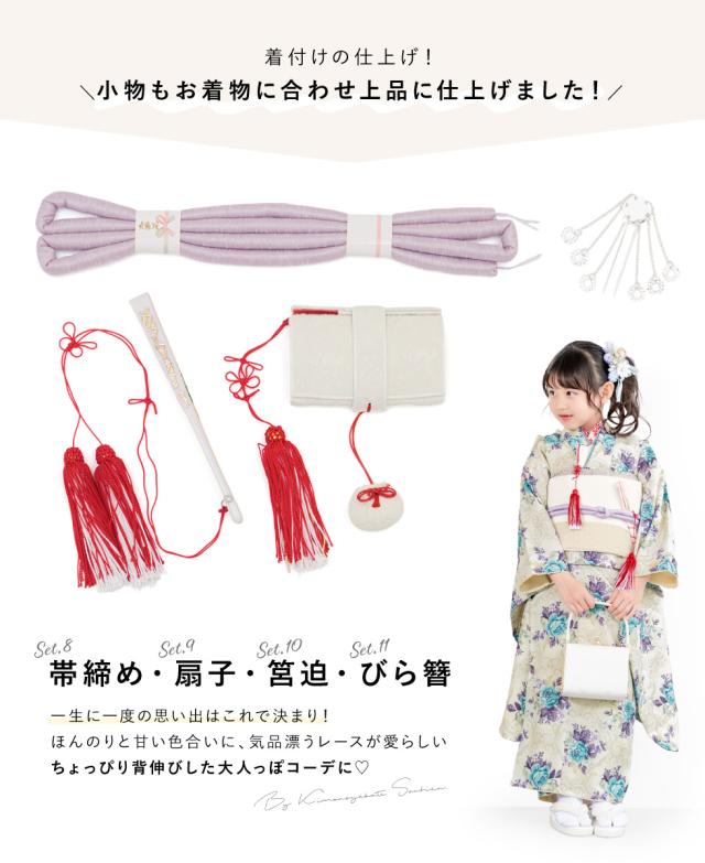 セット内容は【着物・長襦袢・作り帯・草履・バッグ・志古貴・帯揚げ・帯締め・扇子・筥迫・びら簪】の11点です。