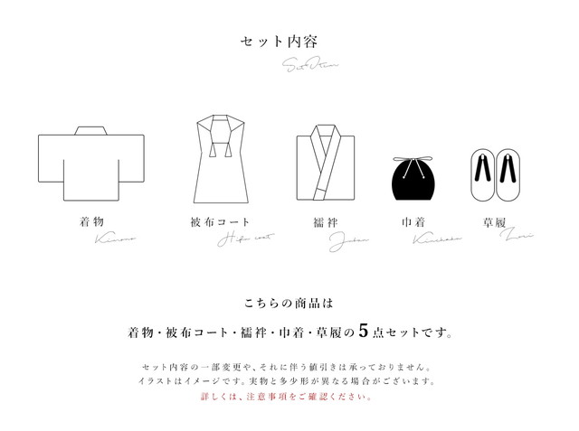 ※こちらの商品は【被布コート・着物(重ね衿縫付済)・襦袢(半衿付)・巾着・草履】です。その他の商品はセットに含まれません。