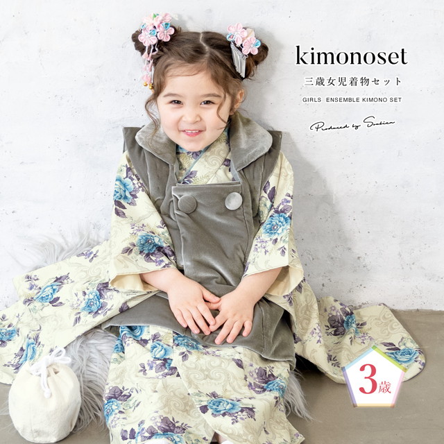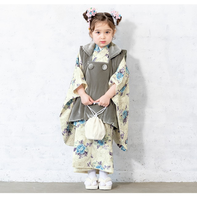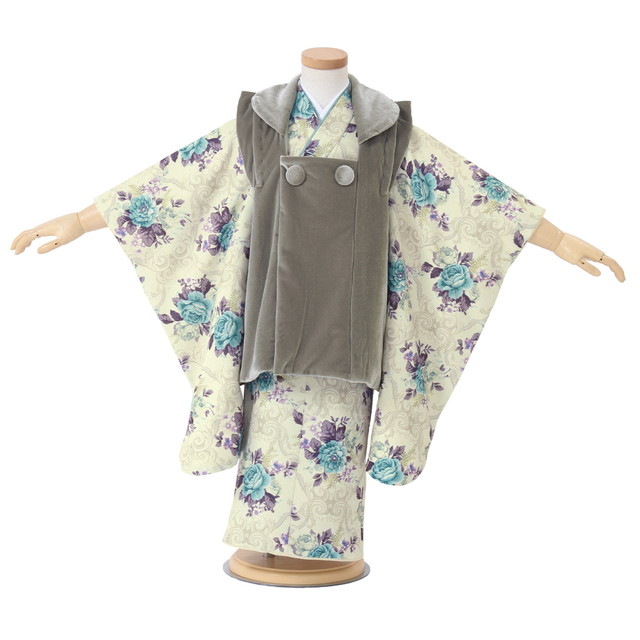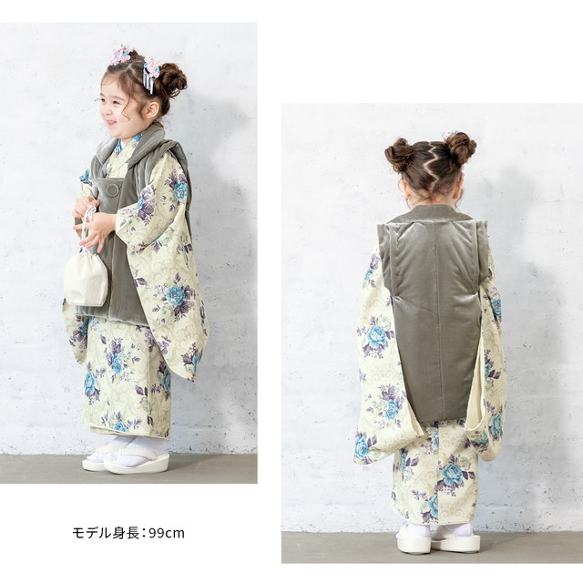 七五三 着物 3歳 販売 女の子 三歳 着物セット 被布セット グレー系 薄緑系 花 被布着 きもの 和服 和装 女児 子供 送料無料