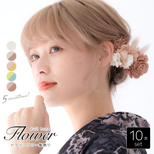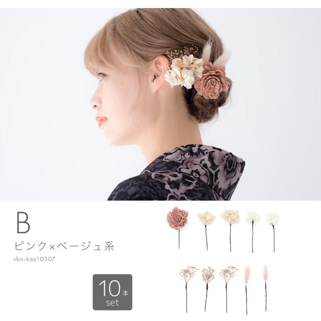 和装のヘアスタイルを彩る、ドライフラワーの髪飾り10点セットです。