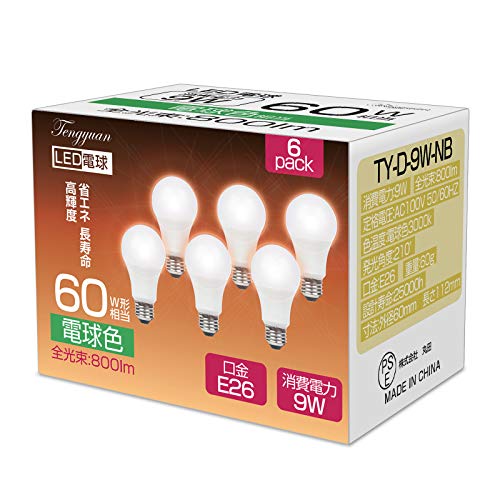 Tengyuan LED電球 E26口金 9W 60W形相当 電球色 3000K 800lm 広配光 高輝度 高演色性 省エネ 密閉形器具対応 断熱材
