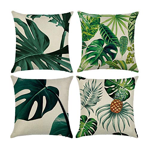 Dekori クッションカバー 45×45Cm 4枚セット 北欧 緑の葉のパターン 座布団カバー おしゃれ リネン クリスマス プレゼント 亜麻 部屋