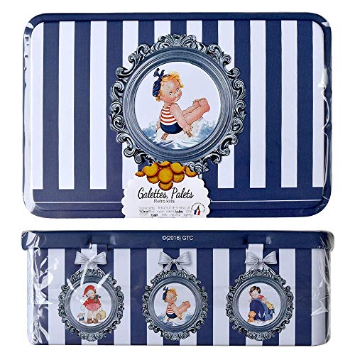 ラ・トリニテーヌ レトロキッズ缶 スクエア ティン缶入り 厚焼きパレット&薄焼きガレット 300g ストライプ (ブルー)