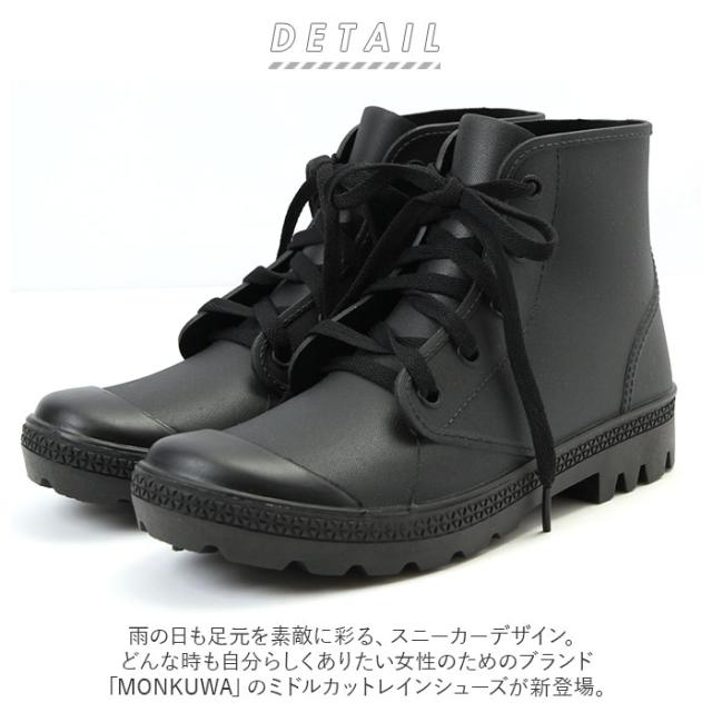 | 商品説明 | ・雨の日も足元を素敵に彩る、スニーカーデザイン。どんな時も自分らしくありたい女性のためのブランド「MONKUWA」のミドルカットレインシューズが新登場。 ・見た目はスタイリッシュなミドルカットタイプのスニーカーなのに、長靴のように雨に強い!いつものスタイルを崩さず、雨の日もオシャレに決められる♪ ・水に強いPVC(ポリ塩化ビニル)素材を使用し、アウトソール・アッパー・シュータンまで、縫い目のない一体成型仕上げ。 ・接地面から約7cmの高さまで雨の侵入をシャットアウトし、しっかり防水。自動車の水はねも、水たまりも怖くない♪(※接地面からの高さ7cmは、Lサイズの商品の場合となります。サイズにより多少防水有効寸法が異なる場合があります。) ・取り外しの可能な中敷きが付属しているので、お手入れ簡単。いつも清潔に履けるのが嬉しいポイント! ・しっかりと溝が刻まれたアウトソールで、雨に濡れた地面やツルツルとした床でも滑りにくい安心仕様。 ・雨の日が待ち遠しくなる、豊富なカラーバリエーション。雨の日でもお洒落に妥協したくないアクティブ女子にオススメ。 |