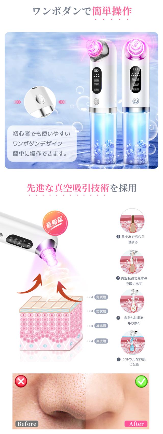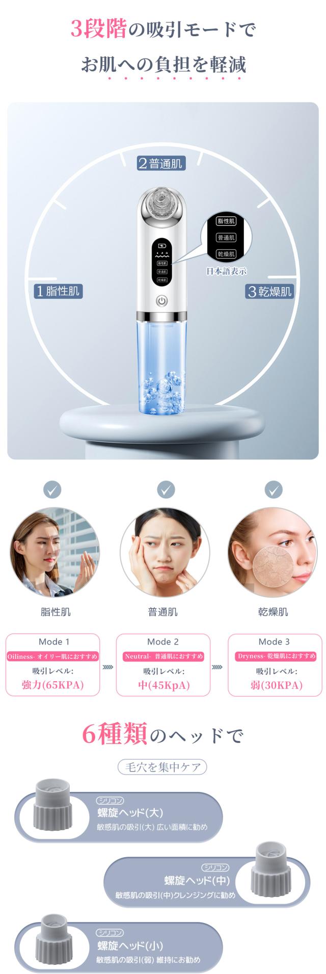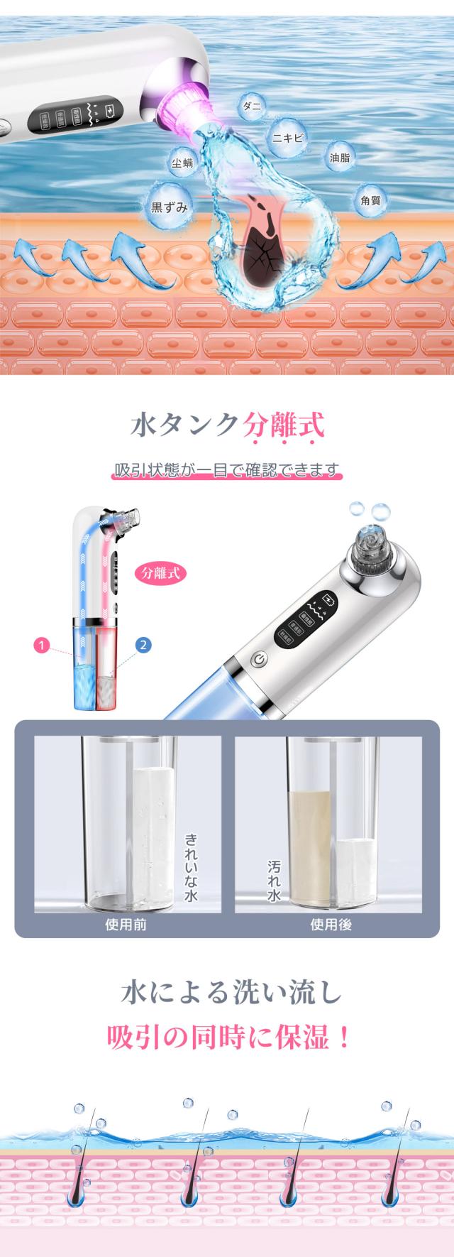 温和な水吸引、毛穴をきれいにする深層汚れをすっきり除去。