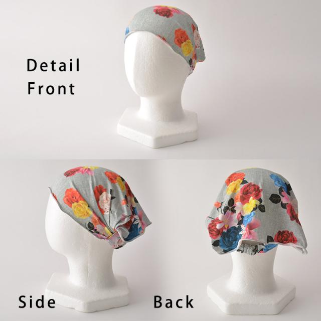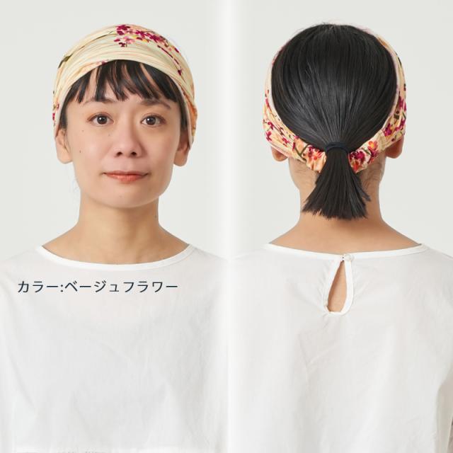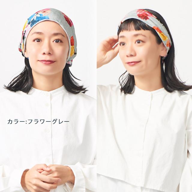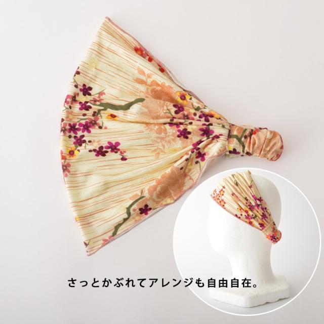 クシュっと縮めてカチューシャ風にかぶったり、生地を広げると後頭部まで広がり三角巾としても使えます。