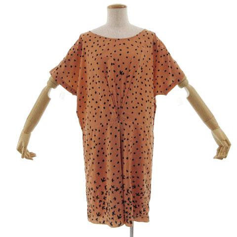 【中古】ティアンエクート TIENS ecoute ワンピース ボートネック ひざ丈 半袖 総柄 サーモンピンク ブラック 黒 38