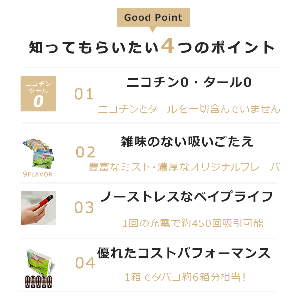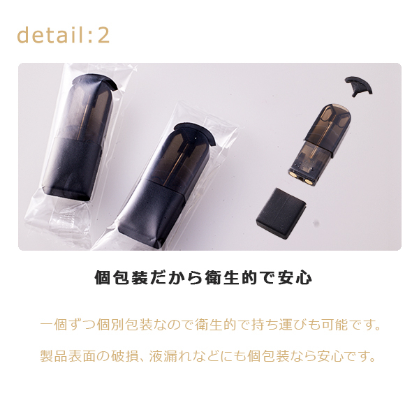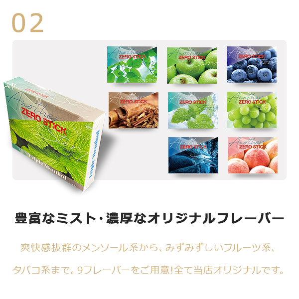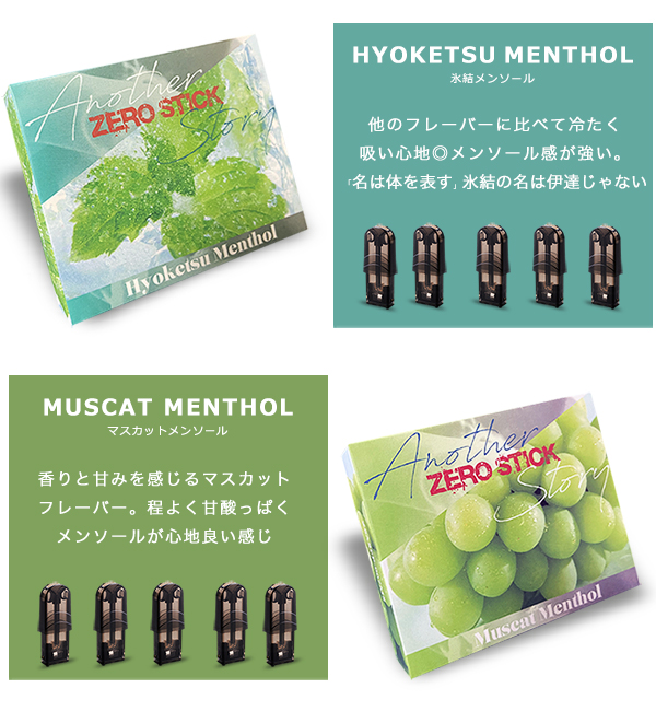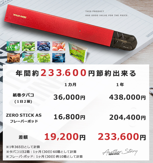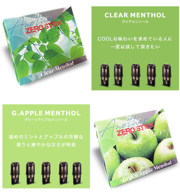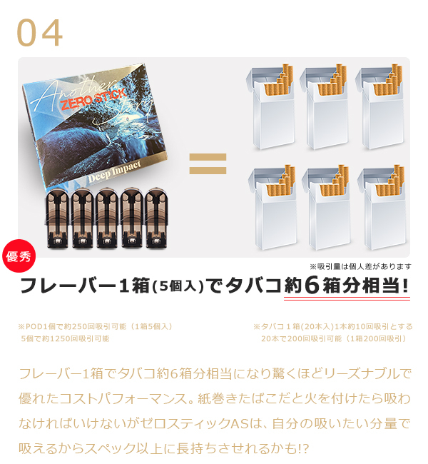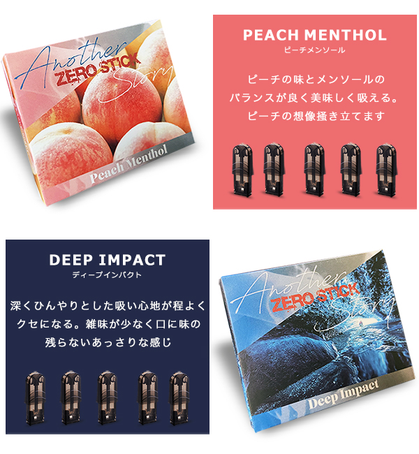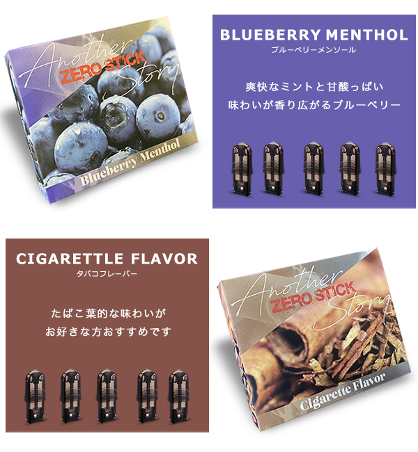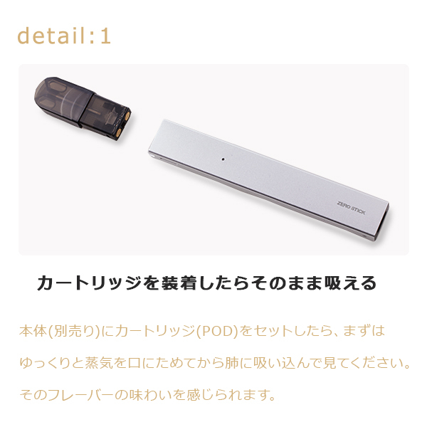 | 商品説明 | 【ゼロスティックから濃厚なオリジナルフレーバーポッドが新登場!】 本体にカートリッジ(POD)をセットして吸い込むだけ!爽快感抜群のメンソール 系から、みずみずしいフルーツ系、タバコ系まで。9フレーバーをご用意! 全て当店オリジナルです。 アナザーストーリーと銘打たれた豊富なミスト・濃厚なオリジナルフレーバー を楽しんで欲しい。 【優れたコストパフォーマンス/フレーバー1箱でタバコ約6箱分相当】 フレーバー1箱でタバコ約6箱分相当になり驚くほどリーズナブルで優れた コストパフォーマンス。紙巻きタバコだと火を付けたら吸わなければいけ ないがゼロスティックASは、自分の吸いたい分量で吸えるからスペック 以上に長持ちさせれるかも!? ※POD1個で約250回吸引可能(1箱5個入) 5個で約1250回吸引可能 ※タバコ1箱(20本入)1本約10回吸引とする。20本で200回吸引可能 (1箱200回吸引)※吸引量は個人差があります 【年間約233,600円節約出来る】 ◆紙巻タバコ(1日2箱) 1カ月で36,000円 1年で438,000円 ◆フレーバーポッド 1カ月で16,800円 1年で204,400円 差額:1ヶ月19,200円 1年だと233,600円! ※1年365日として計算 ※タバコ1日2箱:1ヶ月(30日)60箱として計算 ※フレーバ-ポッド: 1ヶ月(30日)約10箱として計算 【ゼロスティックASフレーバーポッドはこんな方におすすめ】 ・場所を気にせず手軽にリフレッシュしたい。 ・禁煙を初めてから口が寂しい時。 ・気軽に吸いたい、気分転換や口寂しいとき。(部屋や車内etc) ・タバコの本数を減らしたい方。 ・加熱式電子タバコのような面倒なメンテナンスをしたくない方。 ・このページを見てしまった方。 【カートリッジを装着したらそのまま吸える】 本体にカートリッジ(POD)をセットしたら、まずはゆっくりと蒸気を口にためて から肺に吸い込んで見てください。そのフレーバーの味わいを感じられます。 【ニコチンとタールを一切含んでいません】 ニコチン・タールが含まれていないため、安心して吸えます。 衣服や身体にタバコの匂い等付着したりしません。 カートリッジの中身が無くなれば外して新しいものに交換してもらえればOK 【充実した吸いごたえ】 POD1個で約250回吸引可能(1箱5個入)5個で約1250回吸引可能。 当店ゼロスティックAS フレーバーポッドはメンソールの刺激が ノドにガツンと効き、しっかりとしたストローキックを味わえます。 【当店オリジナル 全9フレーバー】 クリアメンソール COOLな味わいを求めている人に一度は試して頂きたい グリーンアップルメンソール 強めのミントとアップルの芳醇な香りと爽やかな甘さが特長 ブルーベリーメンソール 爽快なミントと甘酸っぱい味わいが香り広がるブルーベリー シガレットフレーバー たばこ葉的な味わいがお好きな方おすすめです 氷結メンソール 他のフレーバーに比べて冷たく吸い心地◎メンソール感が強い。 「名は体を表す」氷結の名は伊達じゃない マスカットメンソール 香りと甘みを感じるマスカットフレーバー。程よく甘酸っぱく メンソールが心地良い感じ ピーチメンソール ピーチの味とメンソールのバランスが良く美味しく吸える。 ディープインパクト 深くひんやりとした吸い心地が程よくクセになる。 雑味が少なく口に味の残らないあっさりな感じ 【本体サイズ】:約 H3.7 x W15 x D7.3 cm 【重量】:約5g 【容量】:約 1.0ml 【バッテリー容量】:リチウム電池 230mAh 【吸引可能回数】:約 250回吸引可能 ※吸引回数は吸う強弱によって個人差があります ニコチン:0mg タール:0mg 【原産地】中国 【使用上の注意】 【液漏れについてのご注意】 こちらのポッドは構造上、輸送に伴う激しい温湿度差により稀に微量の液漏れが発生してしまう場合があり、リキッド・ポッド共に品質自体には問題ございません。万が一液漏れがあった場合には大変お手数ですが、ティッシュなどで引き取ってご使用くださいますようお願い申し上げます。 【液漏れ防止対策】 高温多湿や直射日光の当たる場所にポッドを放置しないでください。液漏れを防ぐため、箱を開封した後、未使用のポッドは、吸い口を下にして保管してください。 高温多湿や直射日光の当たる場所にポッドを放置しないでください。 使わずに長期間保管する場合には、なるべく乾燥した場所を選び、フレーバーポットだけを別保存することをおすすめします。 ・20歳未満の未成年者への販売はいたしません。 ・駅や空港、病院などの公共機関や喫煙が禁止されている場所、他人に迷惑をか ける場所での吸収はしないでください。 ・喘息等の持病がある方、妊娠中または授乳中の方は使用しないでください。薬 を服用されている方や持病のある方は医師にご相談の上、ご使用ください。 ・万が一、身体に異常を感じた場合は、直ちにご使用をやめ、医師の診断を受け てください。 ・急な吸収や過度な吸収、連続した吸収等は故障の原因となります。 ・強い衝撃や圧力を加えないでください。 ・水に濡らしたり湿気の多い場所、火気のそばで使用し