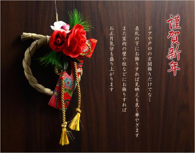 お正月飾り【迎春飾り:ソープフラワー製モダンしめ縄飾り 紅】注連縄 ちりめん使い 玄関飾り 門松 松飾り 造花 ブーケ フラワーアレンジメント 新年 和雑貨 お年賀 縁起物 神様 年神様 歳神様 節句 お正月準備 お正月用品 謹賀新年