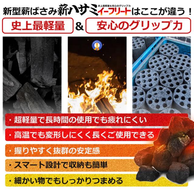 【しっかりと物を掴める火ばさみ】 この火ばさみのグリップは持ちやすく、力を先端に伝えること ができるので、しっかりと物を掴むことができます。火箸よりもしっかりと物を掴めます。