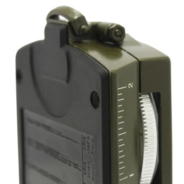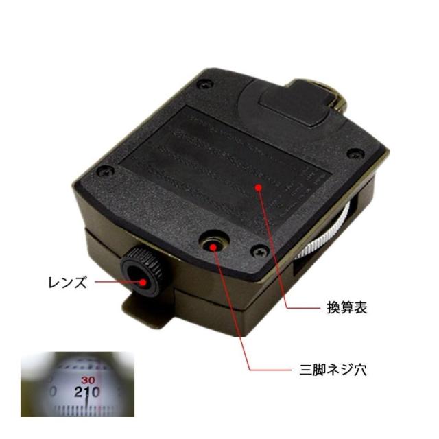 細かい目盛を確実に読み取るための小型レンズと目標物の方角を捕えることのできる覗き窓があり