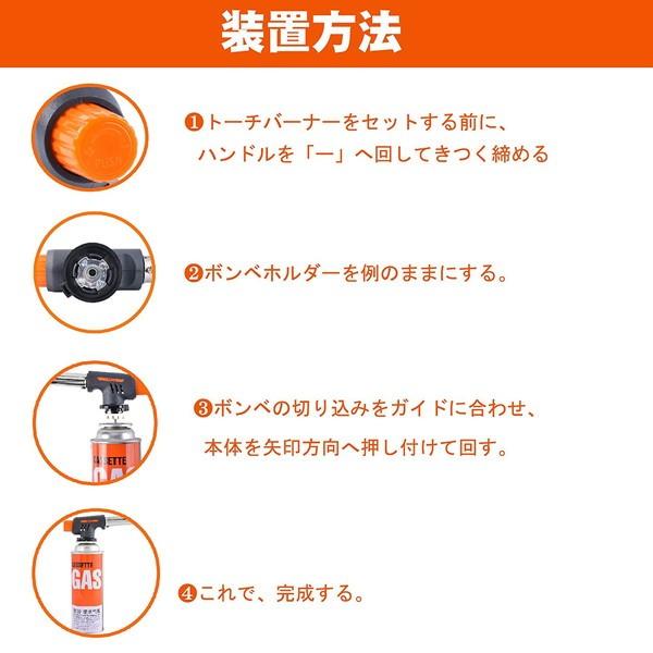 - 取り説などはなく、裏面の説明などは全て英語表記で図説もありませんので、取りつけ方や使い方は自分でなんとなく『こうかな?』とやってみた感じでした。また、消火時のガスのキレがいまいちスッキリしていないので、火とガスを扱う商品としては若干の不安がありました。着火とパワーには問題なく使えます。お値段相応かと。
