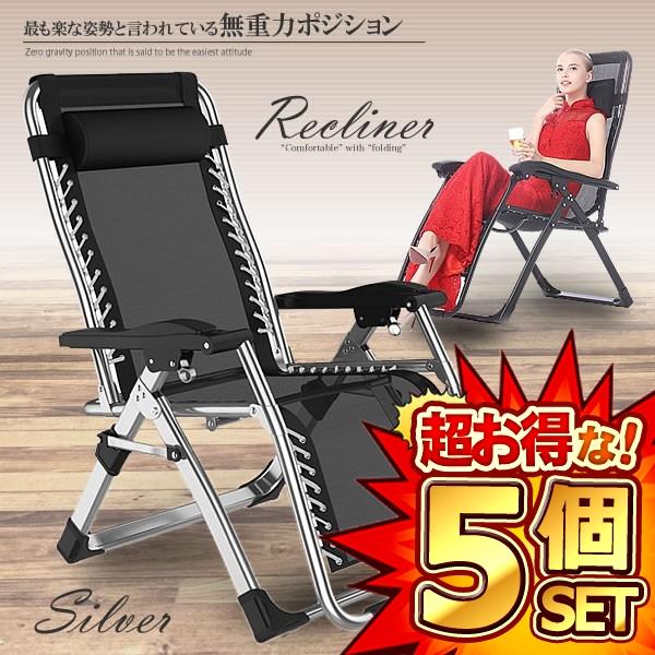 5個セット リクライニングチェア シルバー 枕一体型 折り畳み リラックス リクライニング チェア 折りたたみ 椅子 角度調節 耐荷重200kg 組立不要 昼休み 子 RICLINA-SV
